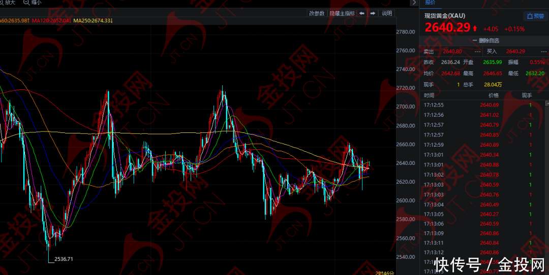 隔夜,现货黄金小幅上涨,日内最高触及2649.24元,最低触及2613.90美元,最终收于2636.24美元。今日欧市盘中,黄金小幅上涨,目前在2640美元附近徘徊。